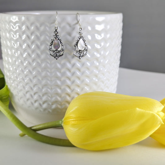 Vintage-look Filigree Earrings with White Shell Teardrop in Sterling Silver