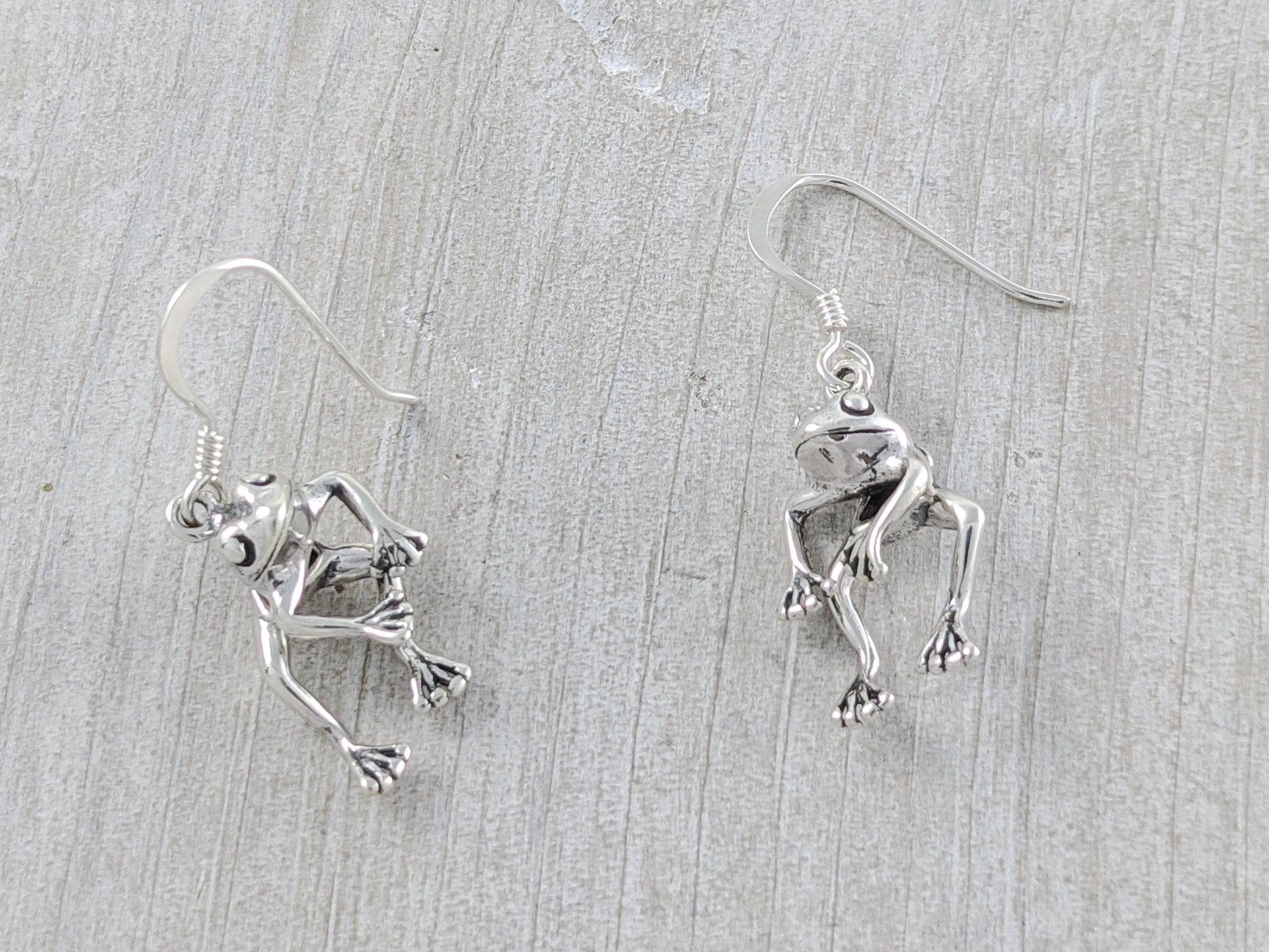 These frogs are jointed at the waist so they move and 'hop' around as they dangle from your ears. Each earring hangs from a Sterling Silver shepherd hook